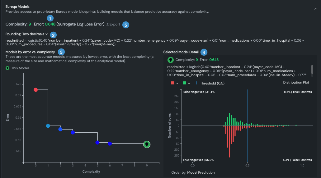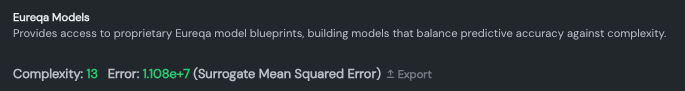 The complexity score reports the complexity of this model, as represented in the Models by Error vs. Complexity chart. The "Eureqa error" value provides a mechanism for comparing Eureqa models. Once you have selected the best-suited model, you can move that model to the Leaderboard to compare it against other DataRobot models. The model expression denotes the mathematical functions representing the model. The Export link opens a dialog for downloading model preprocessing and parameter data. See this note on data partitioning and error metrics.