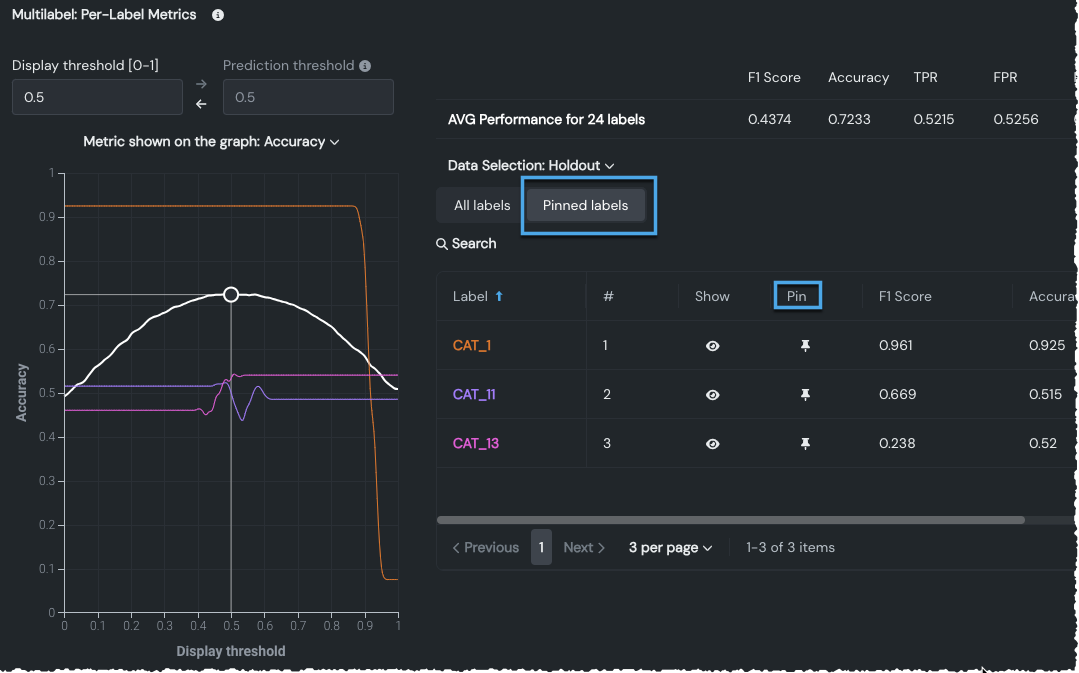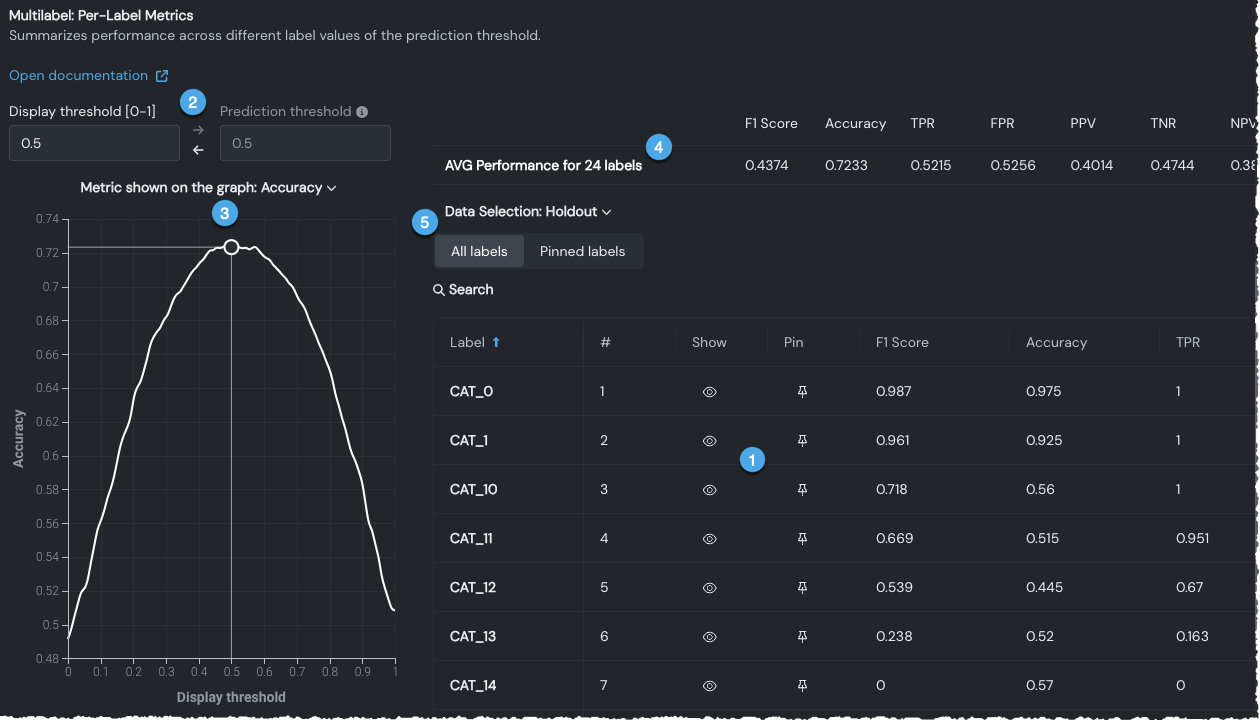 | 5 | Label and data selectors | Sets the data partition—validation, cross validation, or holdout (if unlocked)—to report per-label values for. Display all or only pinned (selected) labels. |