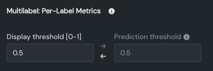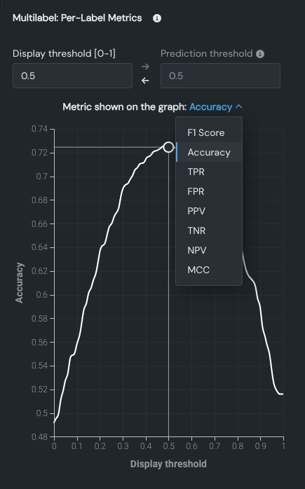 Multilabel: Per-Label Metrics is a visualization designed specifically for multilabel models. It helps to evaluate a model by summarizing performance across the labels for different values of the prediction threshold (which can be set from the page). Configure multilabel modeling during experiment setup.