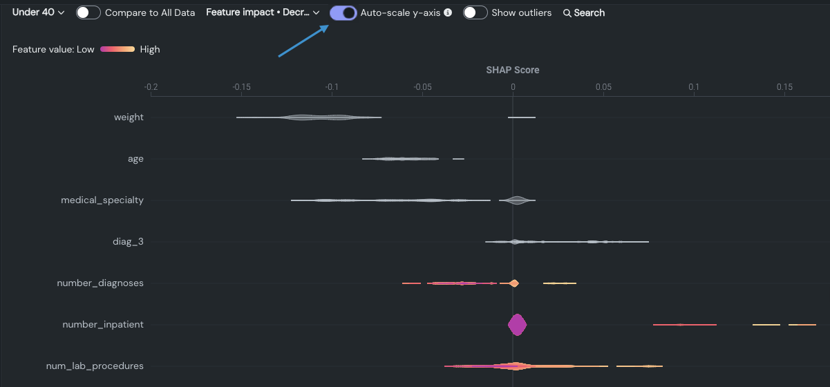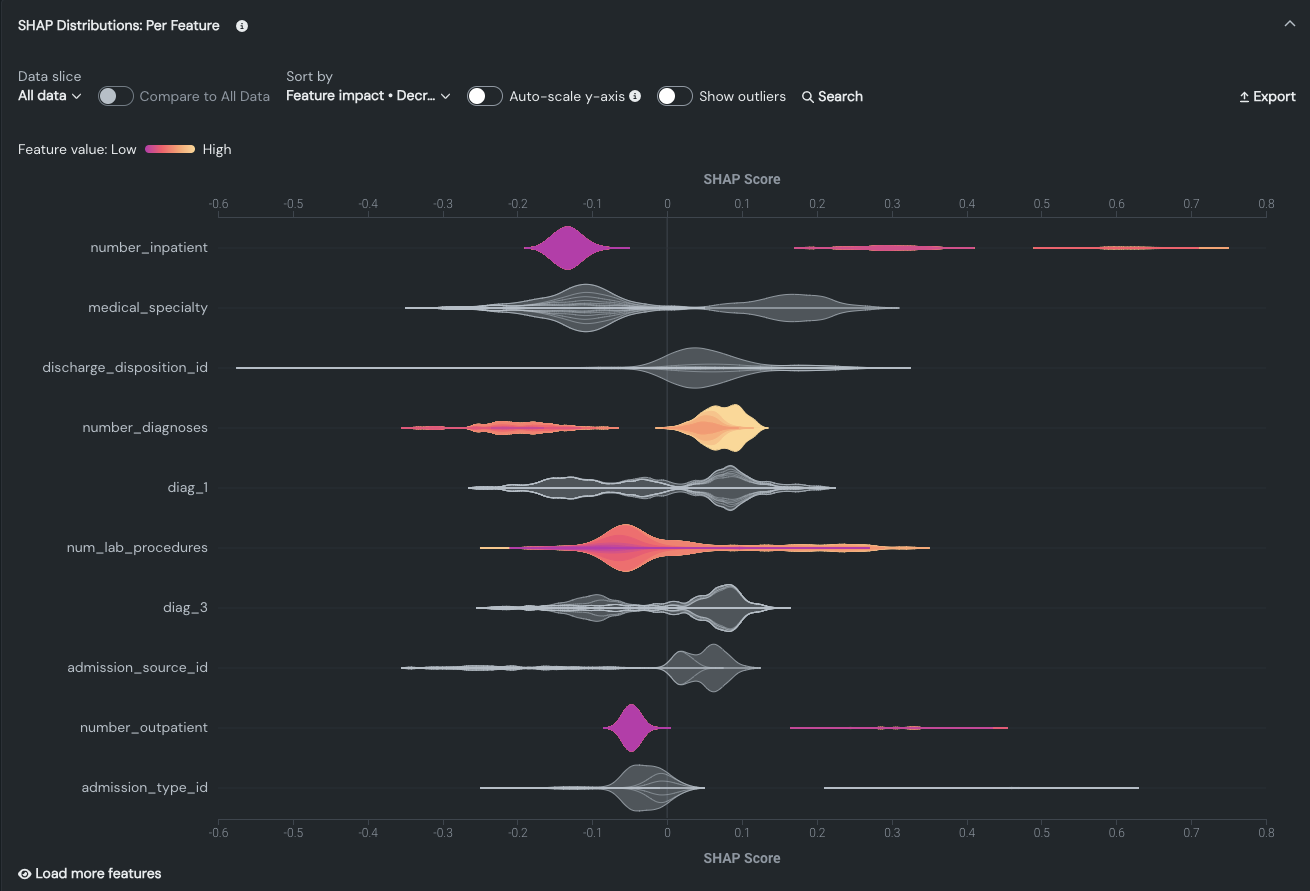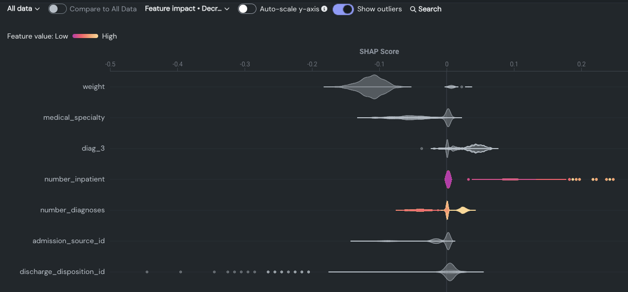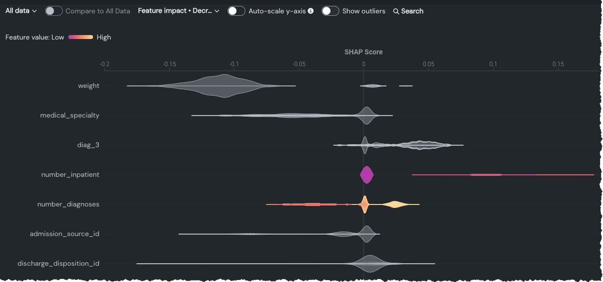 | SHAP Distributions: Per Feature (this page) | Shows the distribution and density of scores per feature using a violin plot for the visualization. |