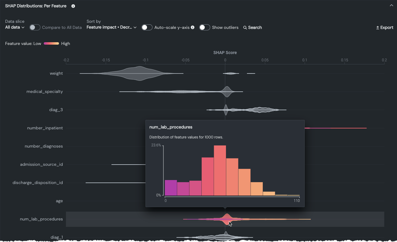 The SHAP Distributions: Per Feature, also called a violin plot, is a statistical graphic for comparing probability distributions of a dataset across different categories. They show the smooth, continuous shape of your data. The vertical axis represents the features in the dataset while the horizontal axis represents the SHAP score. As a result, the plotted density shapes represent the distribution, based on a sampling of up to 1,000 rows, of the data at different values. The width of the "violin" at a given value shows how many data points fall around that value—do they cluster, peak, or spread evenly? See the distribution specifics for examples.