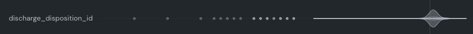 Hover on a discrete feature (gray on on the full plot) to see up to the top seven classes in the full distribution. All others are represented as gray. For example, from admission_type_id for patients under 40 you can see that the value emergency seems to have little impact on the outcome whereas urgent more strongly influences prediction outcomes.