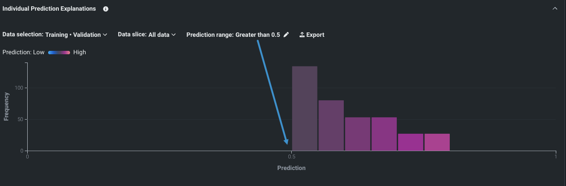 The prediction range control defines both the prediction distribution chart display and the predictions to sample output. Click the pencil icon to open a modal for setting the criteria, based on prediction value: