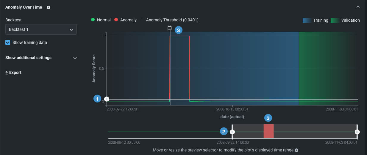 This chart, in addition to handles that control the preview (1), provides an additional handle to control the anomaly threshold (2). Drag the handle up and down to set the threshold that defines whether plot values should be considered as anomalies. Points above the threshold are indicated in red, both in the upper chart and in the preview (3).