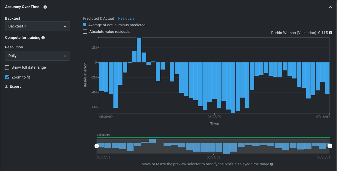 Accuracy Over Time, by default, shows predicted and actual vs. time values for the training and validation data of the most recent (first) backtest. This is the backtest model DataRobot uses to deploy and make predictions. (In other words, the model used to generate the error metric for the validation set.) For time series experiments, you can control the series (if applicable) and forecast distance used in the display. Note that series-based experiments are sometimes compute-on-demand, depending on projected space and memory requirements.