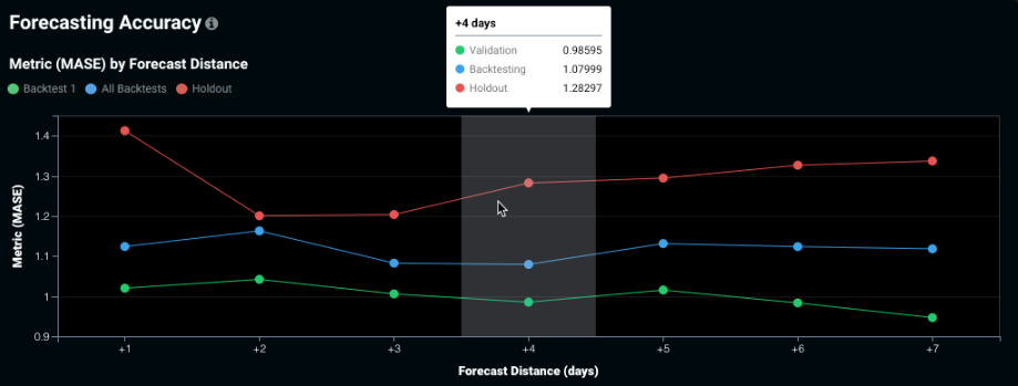 Use Forecasting Accuracy to help determine, for example, how much harder it is to accurately forecast four days out as opposed to two days out. The chart depicts how accuracy changes as you move further into the future. The insight is available for all time series experiments (both single series and multiseries).