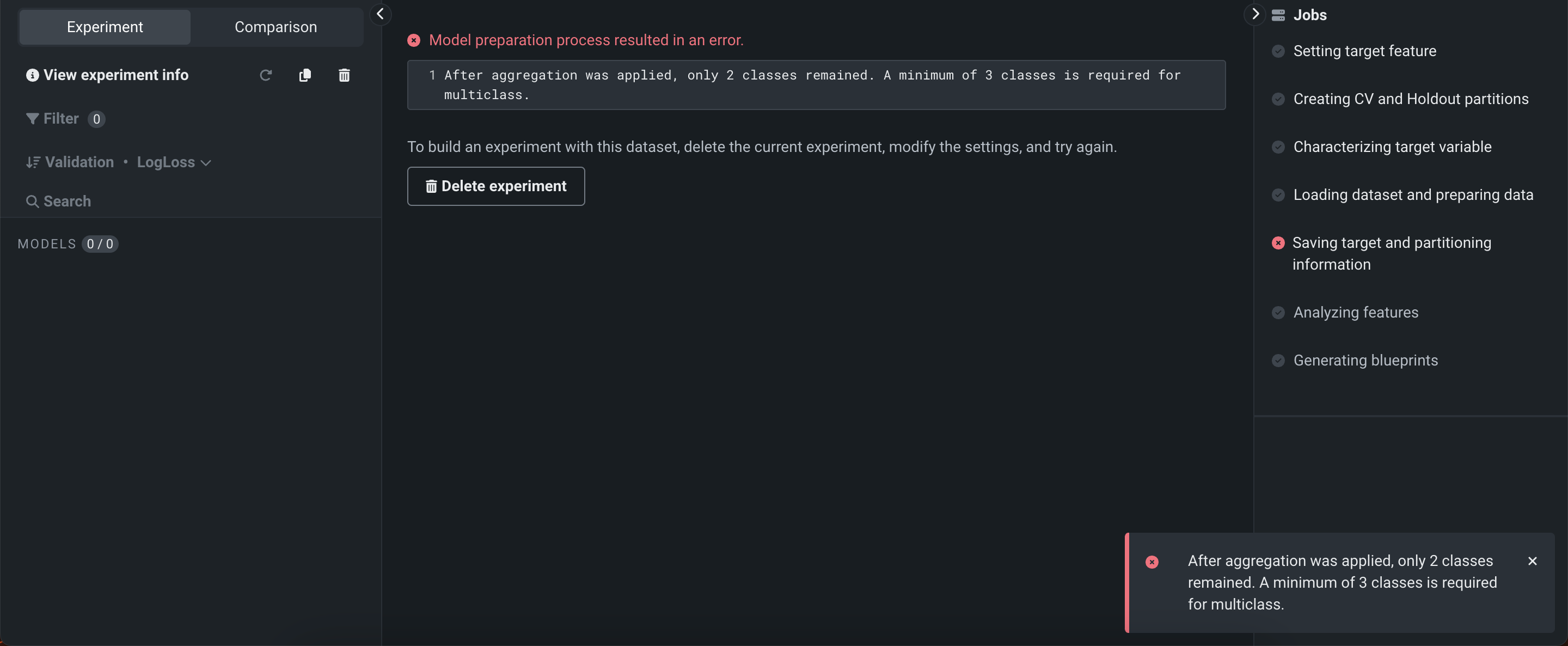 If an experiment or dataset is not correctly configured for the selected problem type, the experiment will fail. For example, if only two classes remain after aggregation for multiclass experiments, which require at least three classes, the experiment fails.