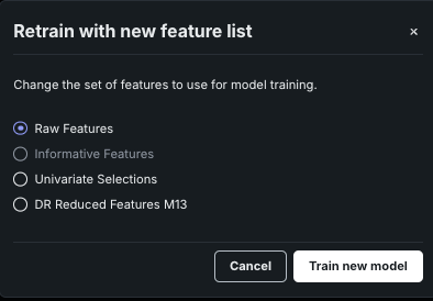 To change the feature list, click the icon next to the current feature list and select a new feature list in the resulting modal. The current list is grayed out and unavailable for selection. Note that you cannot change the feature list for the model prepared for deployment because it is a "frozen" run.