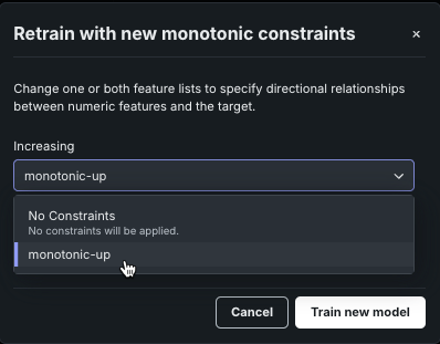 Click the icon next to Monotonic constraints and select at least one new feature list in the resulting modal. You can create monotonic feature lists prior to modeling or post-modeling to apply monotonic constraints. Note that if the model does not support monotonic constraints the label and icon are not displayed.