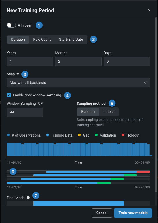 Click the icon to change the training period size and optionally enforce a frozen run. While you can change the training range and sampling rate, you cannot change the duration of the validation partition once models are built.
