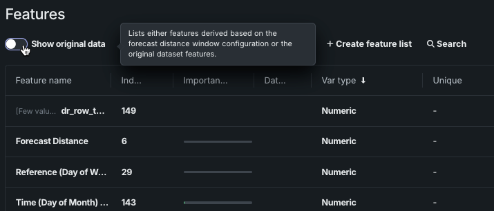 For time-aware experiments, the Data preview, Features, and Feature lists tiles have a toggle that controls whether the display is derived data only or derived and original data.
