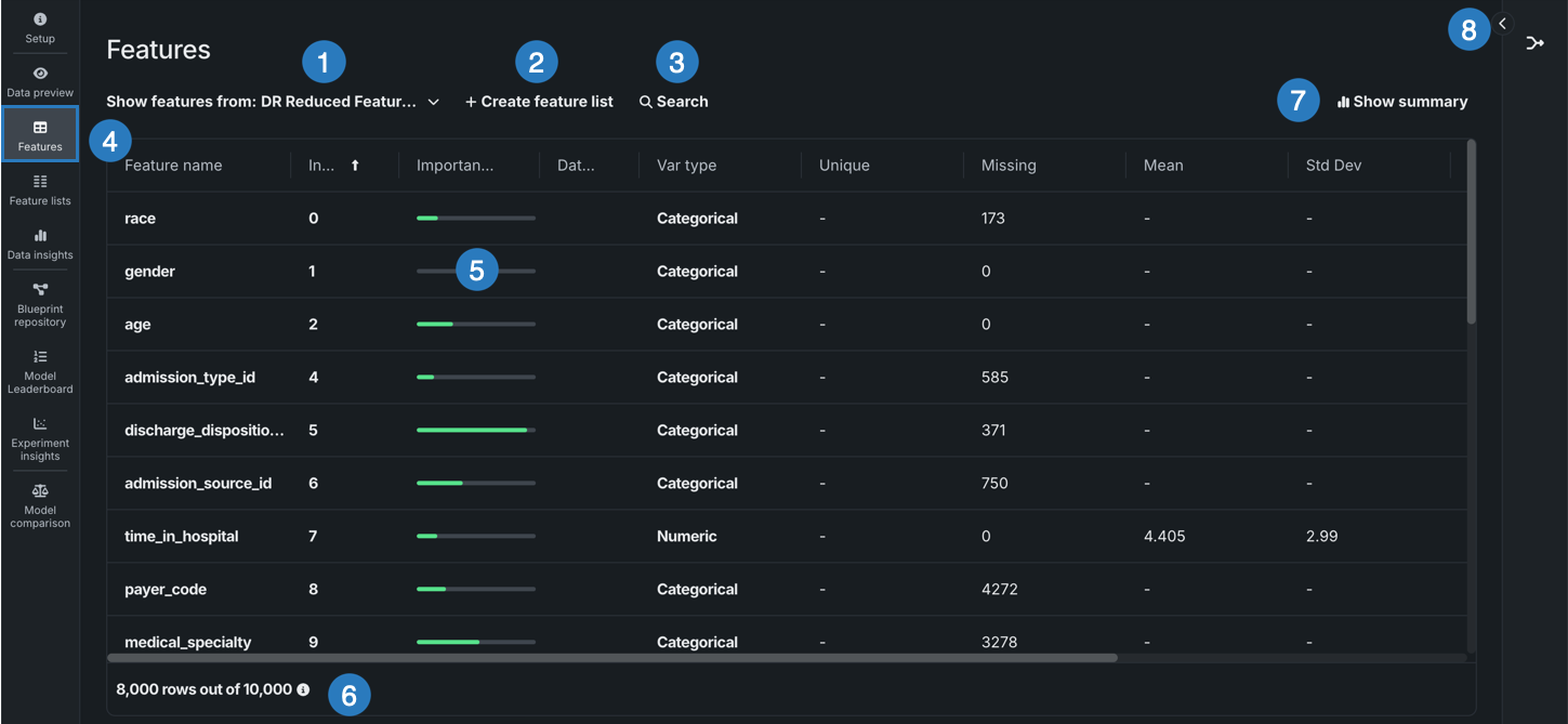 | 5 | Importance column | Displays green bars in the Importance column which are a measure of how much a feature, by itself, is correlated with the target variable feature importance. |