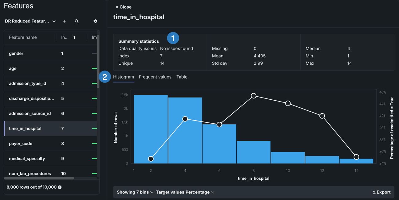 Displays features in a table format alongside feature importance and summary statistics. Select specific features to view more detailed data insights than those shown on the Data preview tile. |