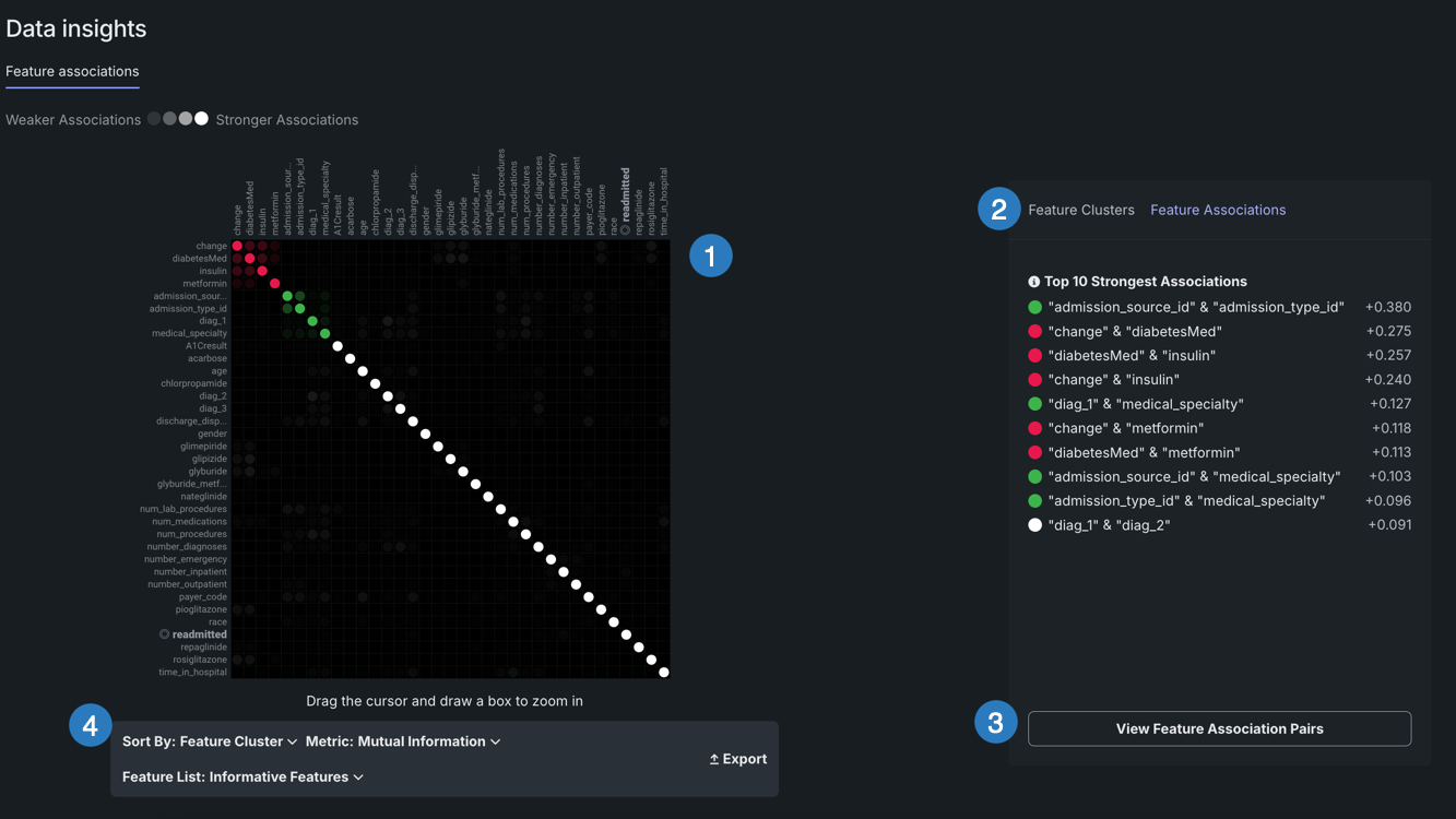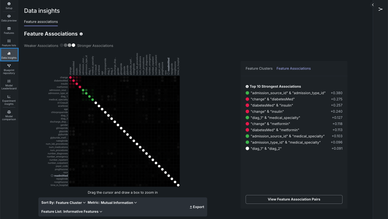 Accessed from the Data insights tile, the Feature Associations insight provides a matrix to help you track and visualize associations within your data. This information is derived from different metrics that: