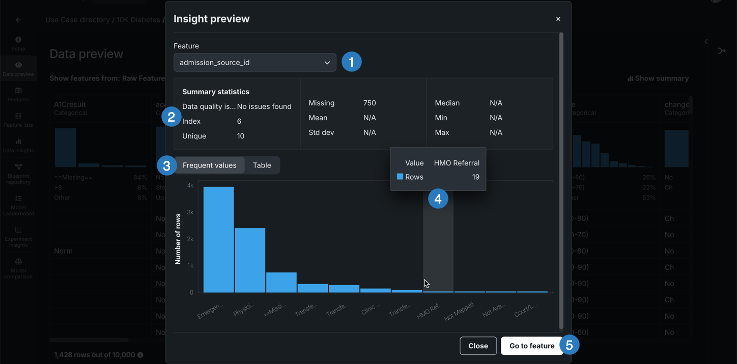 | 2 | Insights | Allows you to view available insights for the variable type of the feature. |