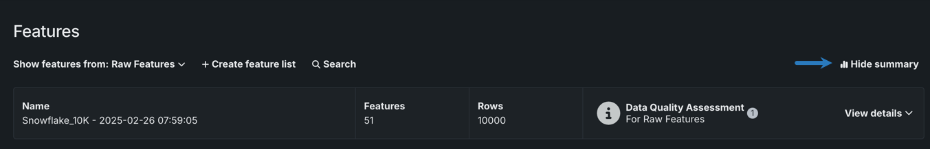 You can access the Data Quality Assessment by clicking Show Summary (unless already open, then the button displays Hide summary) on either the Data Preview or Features tile.