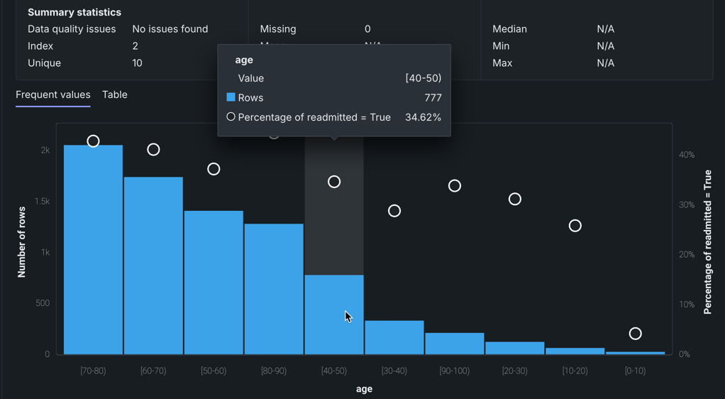 In this example, there are 846 people who had between 44-49.999999 lab procedures. The average target value represented by the circle (in this case, the percent readmitted) is 37.23%. (The orange dots correspond to the right axis of the histogram.)