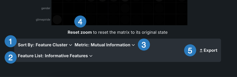 | 1 | Matrix | Lists up to the top 50 features, sorted by cluster, on both the X and Y axes. |