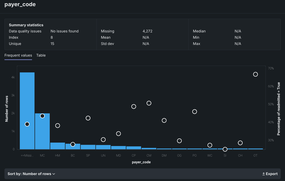 The Frequent Values chart is a histogram that in addition to showing the number of rows containing each value of a feature and the percentage of rows for each value of the target, also reports inliers, disguised missing values, and excess zeros.