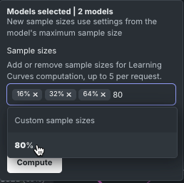 Adding sample sizes causes DataRobot to recompute for the newly entered sizes. Computation is run for all models, or, if you selected one or more models from the list of the right, only for the selected model(s). While per-request size is limited to five sample sizes, you can display any number of points on the graph using multiple requests. The sample size values you add via Compute Learning Curves are only remembered and auto-populated for that session; they do not persist if you navigate away from the page.