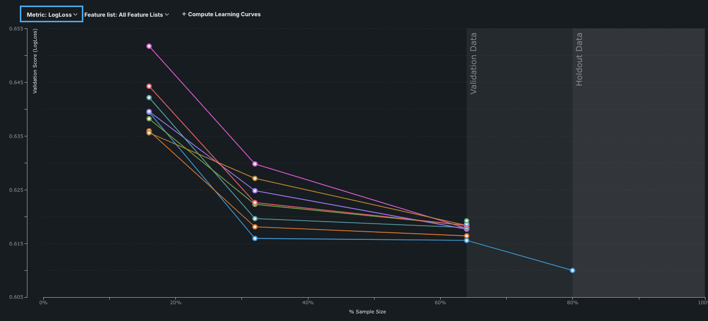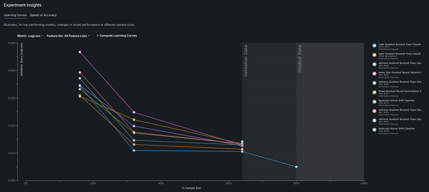 The Learning Curves graph uses the metric selected in the dropdown to plot model accuracy—for example, if LogLoss is chosen, the lower the log loss, the higher the accuracy. The display plots, for the top 10 performing models, log loss for each size data run. The resulting curves helps to predict how well each model will perform for a given quantity of training data.