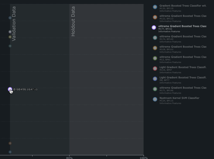 Predictive accuracy often comes at the price of increased prediction runtime. The Speed vs Accuracy analysis plot shows the tradeoff between runtime and predictive accuracy to help choose the best model with the lowest overhead. The display is based on the validation score, using the currently selected metric.