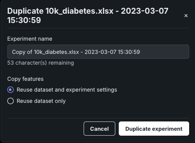 Use the link at the top of the Leaderboard to duplicate the current experiment. This creates a new experiment and can be a faster method to work with your data than re-uploading it.