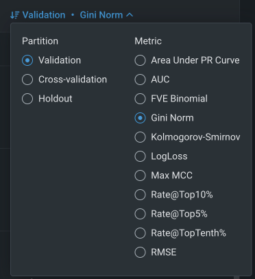 By default, the Leaderboard sorts models based on the score of the validation partition, using the selected optimization metric. You can, however, use the Sort models by control to change the basis of the display parameter when evaluating models.