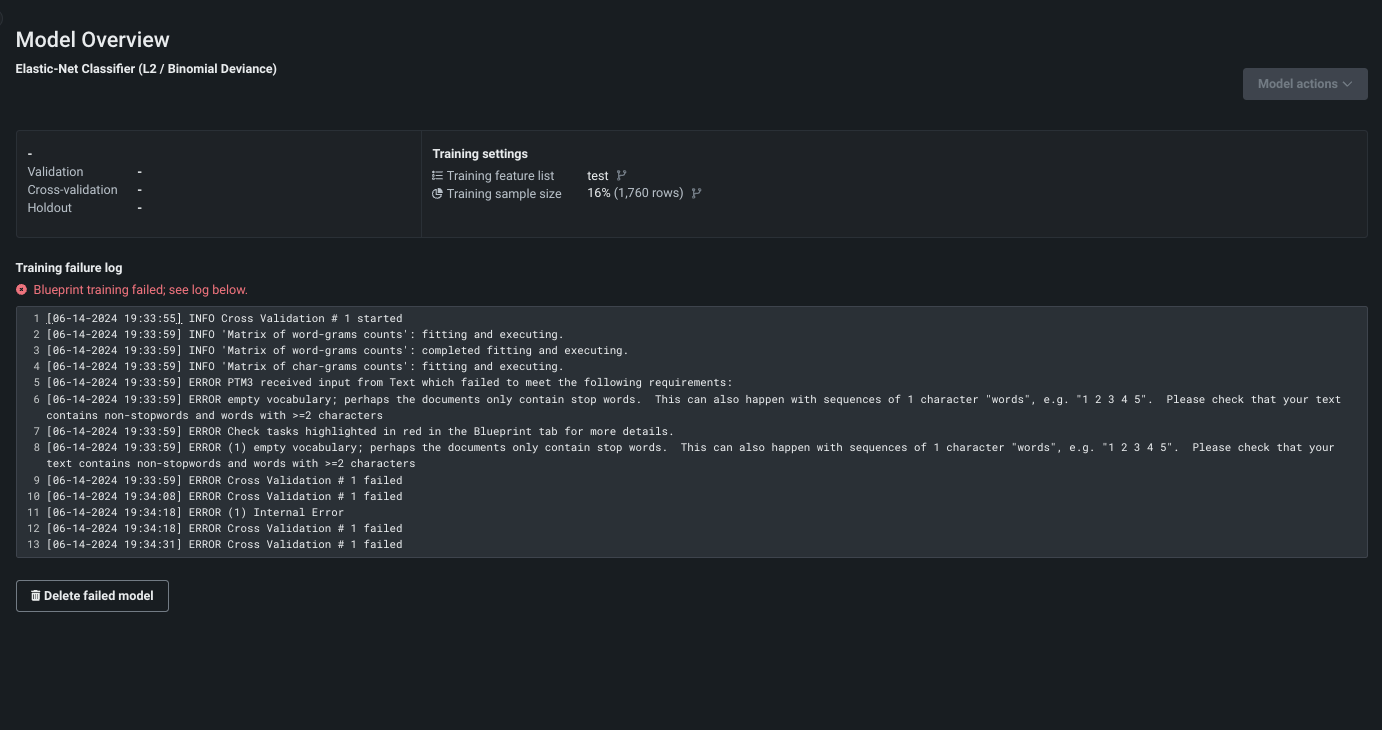 Use the Delete failed model button to remove the model from the Leaderbaord.