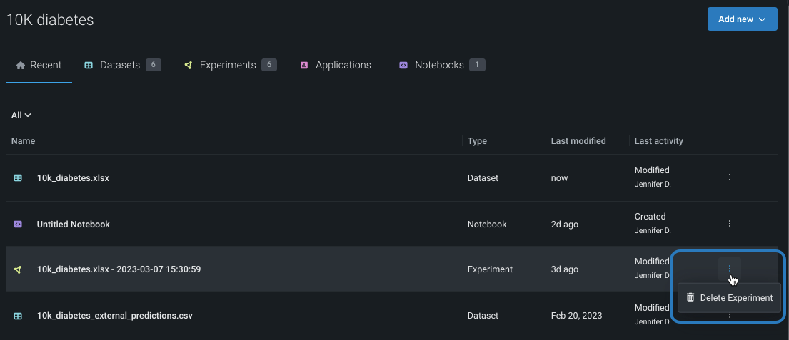 At any point after models have been built, you can manage an individual experiment from within its Use Case. Click the Actions menu to the right of the experiment name to delete it. To share the experiment, use the Use Case Manage members tool to share the experiment and other associated assets.