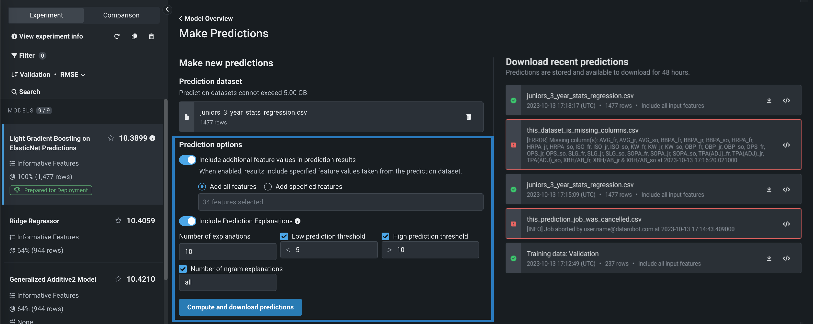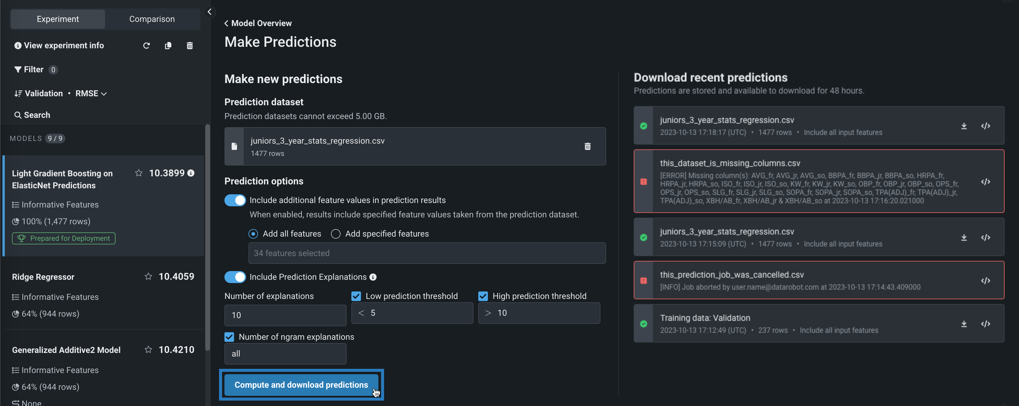 After you configure the Prediction options, click Compute and download predictions to start scoring the data, then view the scoring results under Download recent predictions: