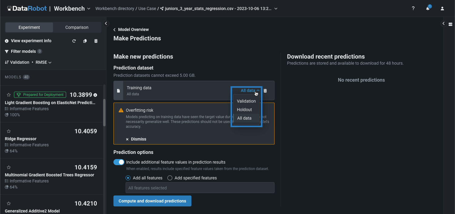 Depending on the option you select and the sample size the model was trained on, predicting on training data can generate in-sample predictions, meaning that the model has seen the target value during training and its predictions do not necessarily generalize well. If DataRobot determines that one or more training rows are used for predictions, the Overfitting risk warning appears. These predictions should not be used to evaluate the model's accuracy.