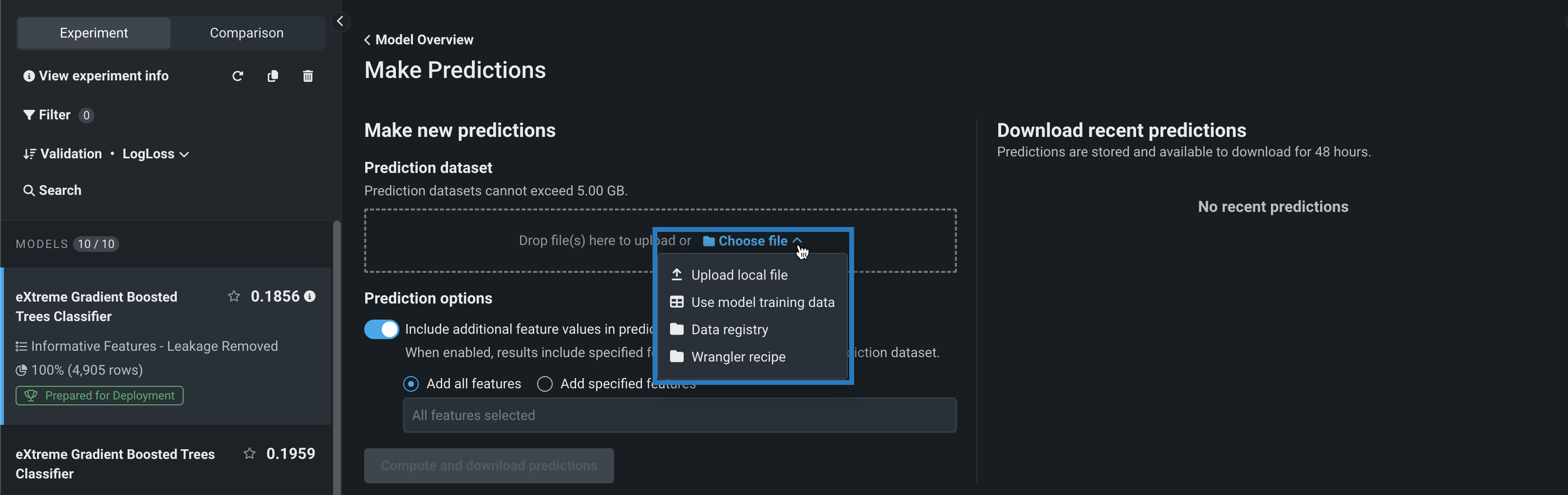 On the Make Predictions page, upload a Prediction source, drag a file into the Prediction dataset box, or click Choose file and select one of the following: