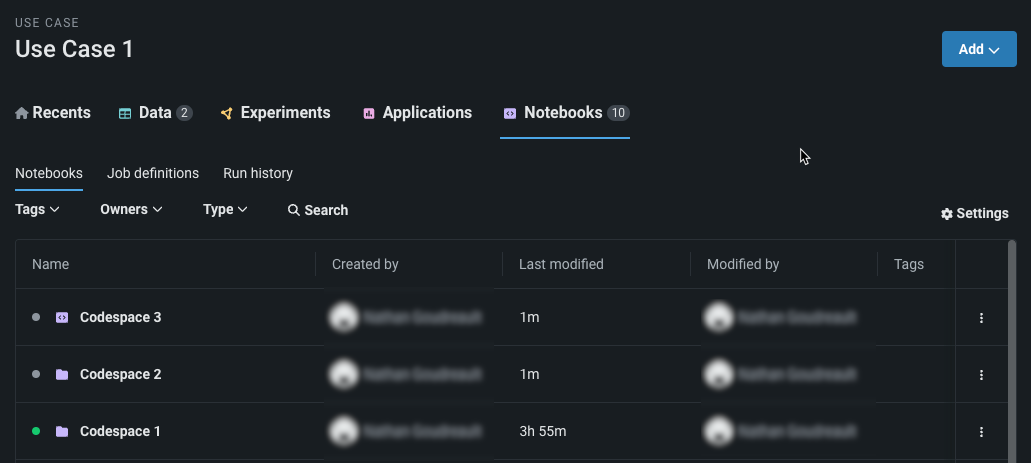 This page outlines how to start a codespace session, upload files to a codespace, and manage its contents. You can view and manage codespaces from the Notebooks tab of the Use Case home page.