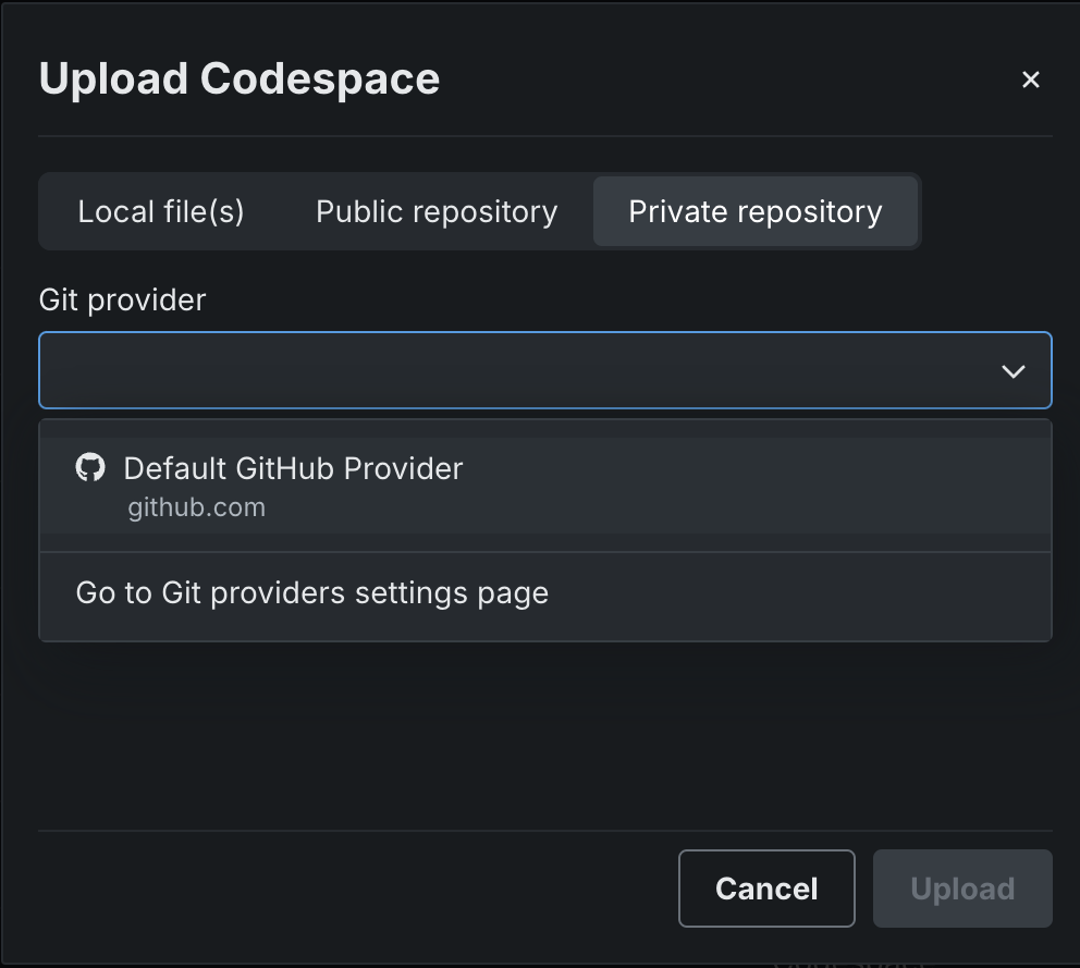 To create a codespace from a private repository, select the Private repository tab and choose the provider from the dropdown. Only providers that you have already authorized appear here.