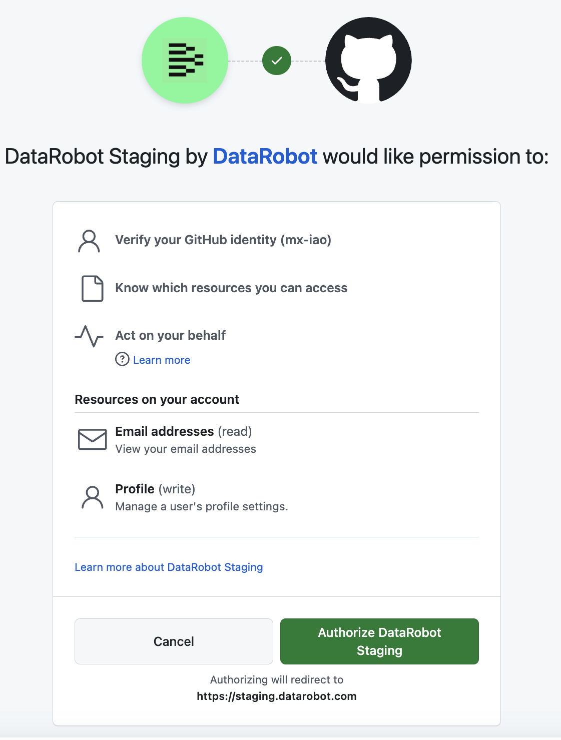 GitHub configuration requires an additional step after authorization. Authorizing DataRobot to GitLab or Bitbucket accounts does not require this additional configuration step.