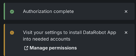 When you return to the Git providers page, DataRobot notifies you to visit the settings page on GitHub to install the DataRobot App. Click Manage Permissions in the notification to get redirected to GitHub.