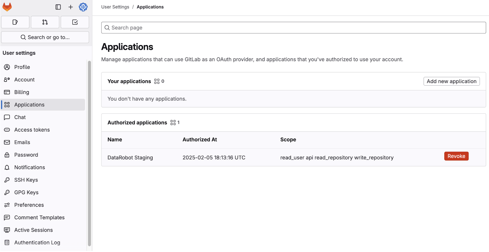 For GitLab and Bitbucket, once you’ve revoked authorization, you will need to complete an additional step in the Git provider's settings to revoke authorization of the DataRobot OAuth app. For example, in GitLab, revoke the authorization on the Applications page in the GitLab user settings.
