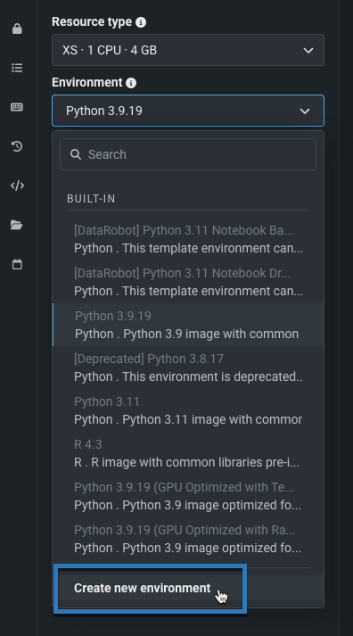 ) in the notebook sidebar and expand the Environment field dropdown. Scroll to the bottom of the list and select Create new environment. This brings you to the Environments page in the Registry.