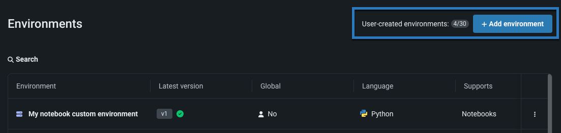 On the Environments page, you can create and access environments for both notebooks and models. To create a new custom environment for a notebook and configure its details, click + Add environment.