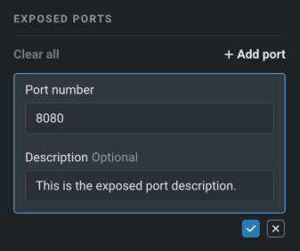 To create a port for port forwarding, click + Add port, enter a Port number and optional Description, and then click the accept icon :