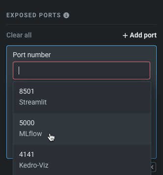 The port number dropdown includes options for the default port number options commonly used by OSS tools (MLFlow, Streamlit, etc.):