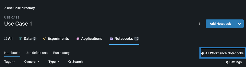 Additionally, you can view notebook jobs configured across all Use Cases configured in Workbench. To do so, access a Use Case and navigate to its Notebooks tab. Then click All Workbench Notebooks.