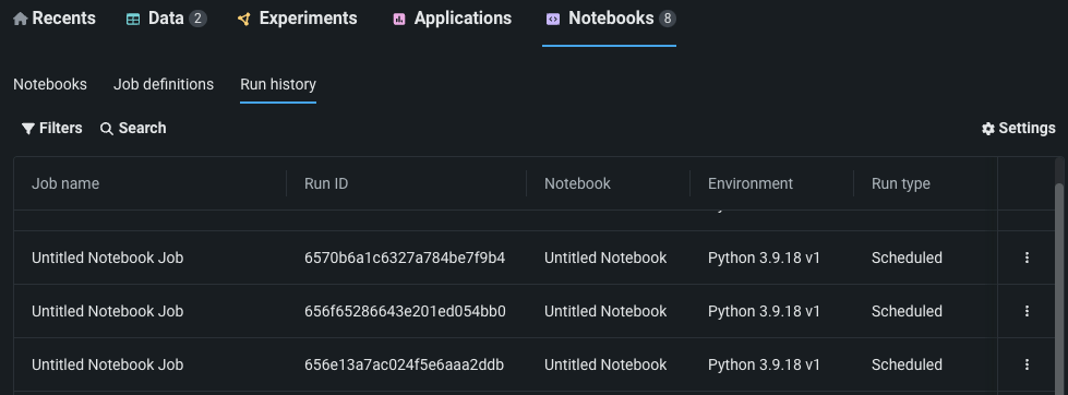 This brings you to a page that displays all notebooks created across every Use Case that you have access to. From here, you can select the Job definitions tab to view all notebook jobs configured across these Use Cases.