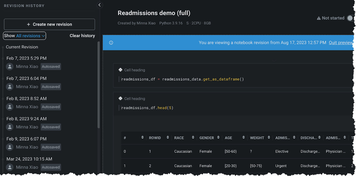 Each notebook run has a corresponding notebook revision, which is a snapshot of the notebook (and cell outputs) that DataRobot automatically collects at the end of each notebook job run. This allows you to go back and view the run results of previous notebook runs, even if the current version of the notebook has changed. The notebook revision is displayed in the Run results column in the Run history table. Click on a run in the table to open the notebook revision for that corresponding run.