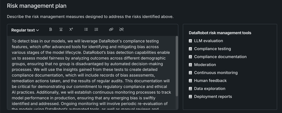 In this example, the insurance organization describes how it plans to identify and mitigate bias at various stages of the model lifecycle through bias detection capabilities and compliance documentation.