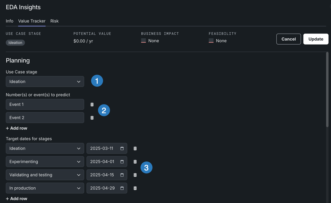 | 3 | Target dates for stages | Dates to indicate when the Use Case is expected to reach individual stages. Select a stage from the dropdown and a date using the calendar picker. Click + Add row to define additional stages. Note that you can only set one target date for each stage. |