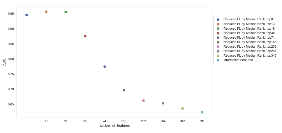 特徴量の数が501から13に減ると、曲線下面積(AUC)が大きくなることで示されるように、モデルのパフォーマンスが向上します。 この視覚化は、特徴量選択曲線と呼ばれます。
