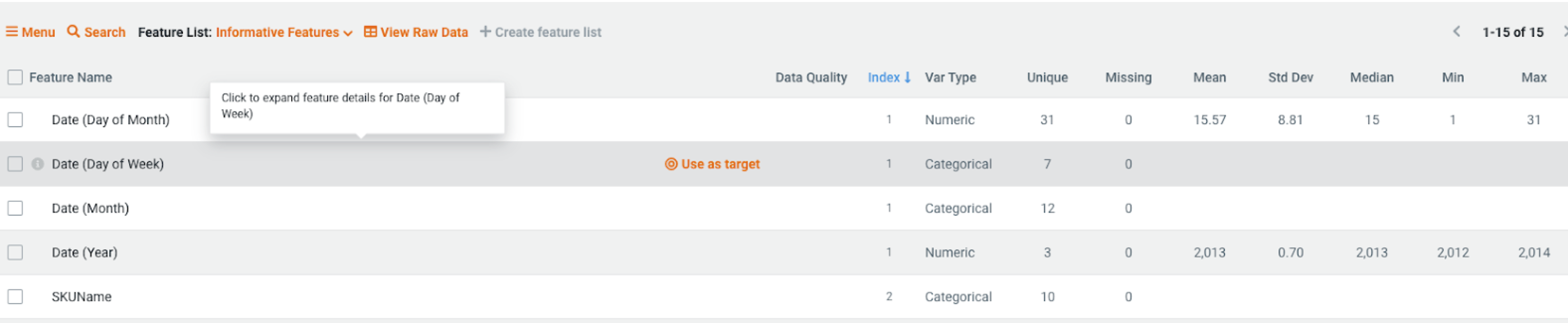 Build feature lists to approach modeling with the appropriate variables. For this project, DataRobot uses the provided dates and creates variables for the Day of the Week, Day of the Month, the Month, and the Year.