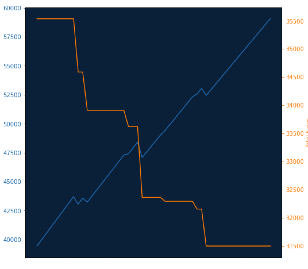 Select a single product and observe its unique relationship between price and sales. In this graph, note the intersection point between sales and revenue.